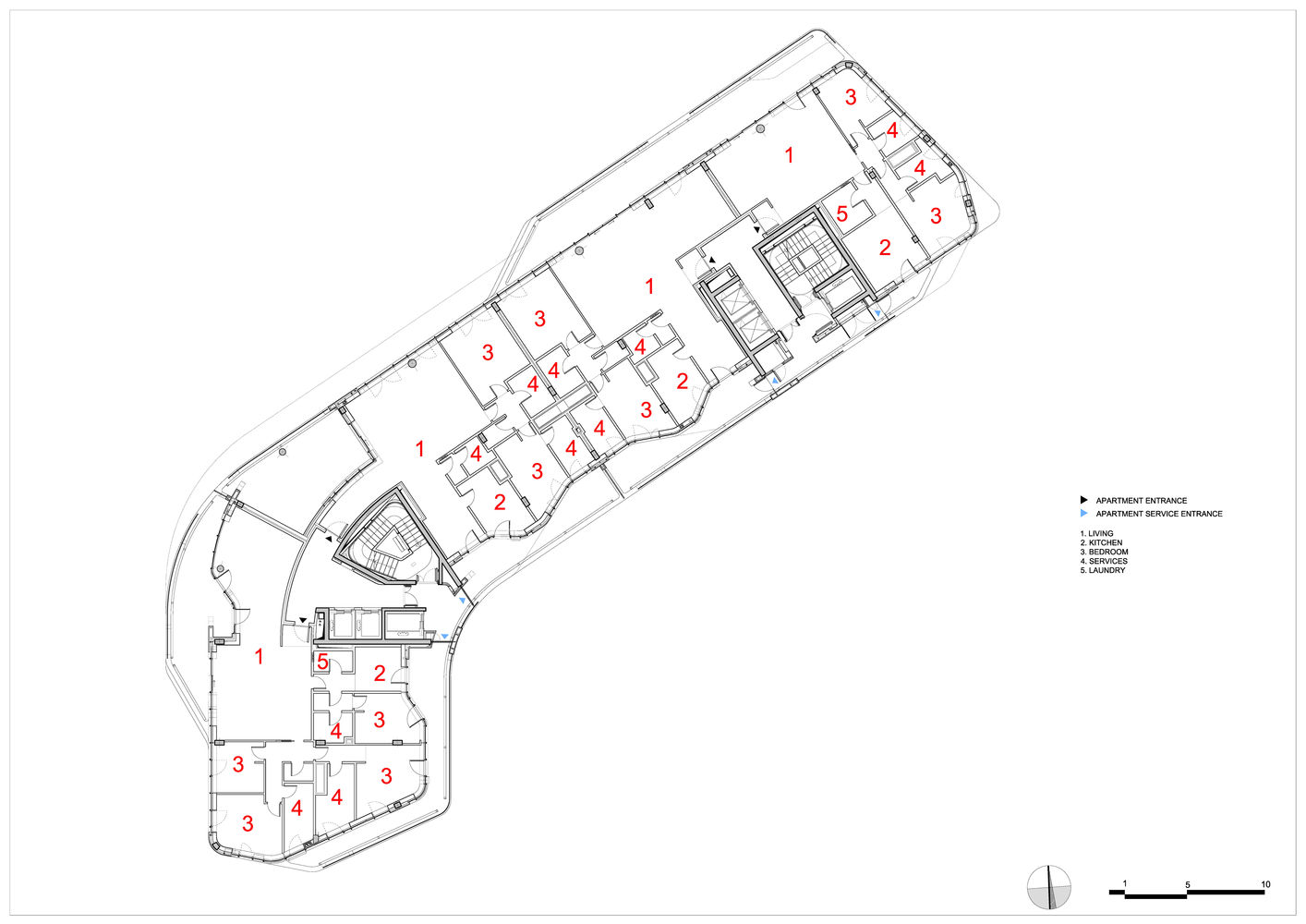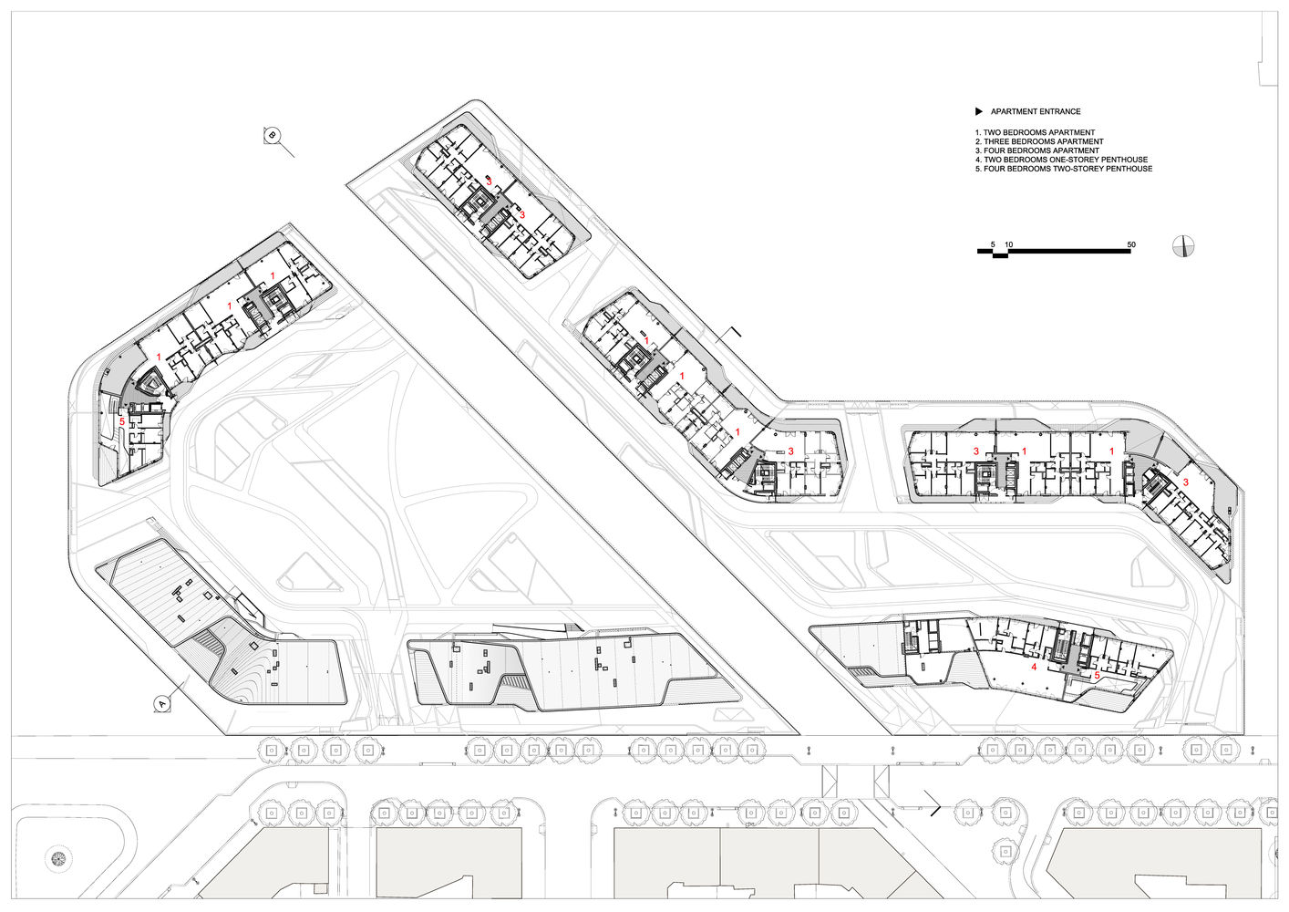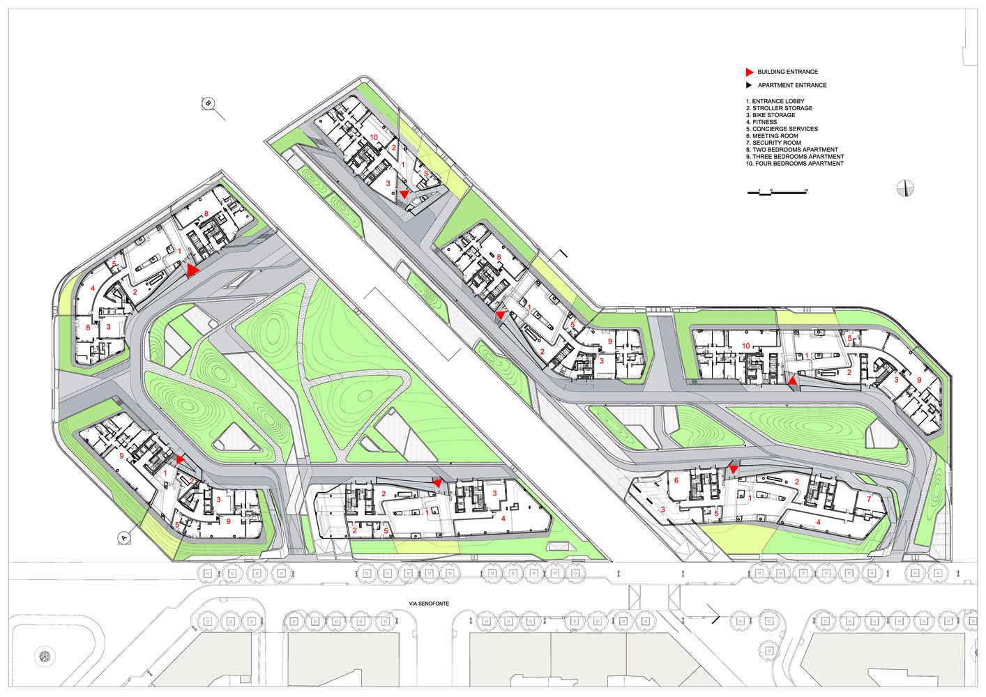 一樓的挑高大廳因有來自大型落地開口的光源而顯得光線充足,此設計也是要延續公園的視覺效果。住戶可以從主要電梯與送貨電梯到達所有樓梯井,亦可從地下停車場方便安全地直接上樓到自己住的那棟大樓。
