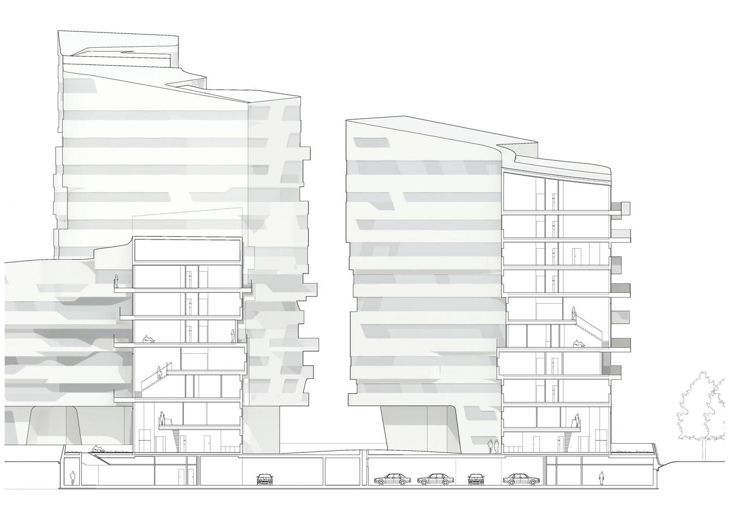 外牆的素材(纖維混凝土與天然木板)強調出大樓的容積動線,並讓內部中庭能保有隱私與居家感。大樓內部可直接通往寬敞的平台。所有的公寓的結構與植被形式皆能輕易依照住戶需求調整。每個住家的尺寸大小、透光及格局都不同:從兩房套房、大型家庭住宅到雙層頂樓公寓都有。