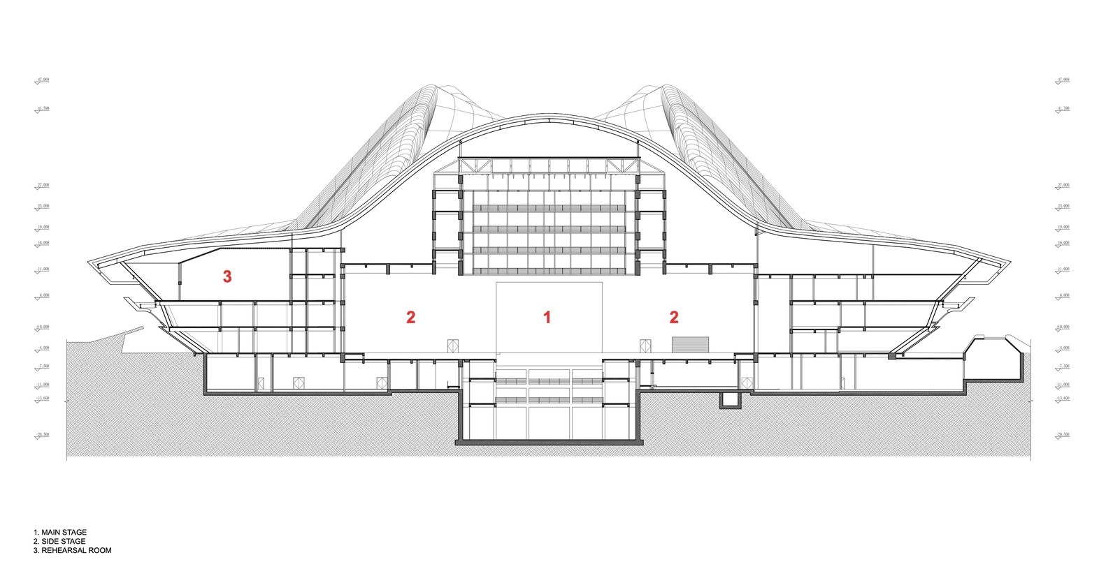 這三座大型空間總面積為115,000平方公尺,各具有獨特特色,且彼此獨立。他們在不同的時間開放,以確保這個藝文中心,不論何時都充滿活力。當藝術博物館閉館時,劇院緊接著開放,而小劇院則是時常舉辦各種不同的活動,以確保這邊能時常開放給大眾。