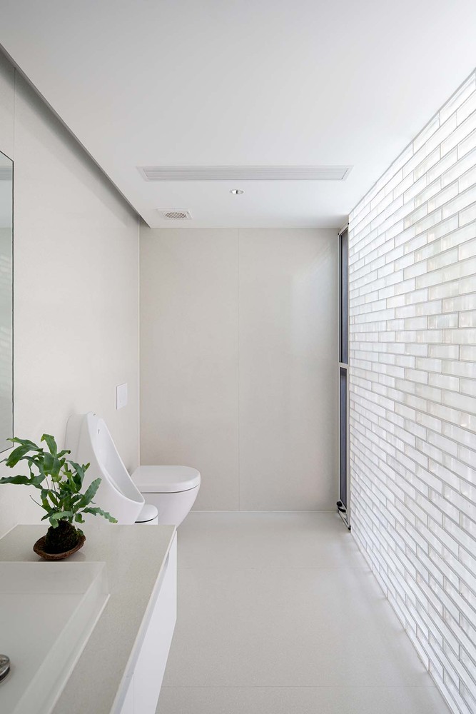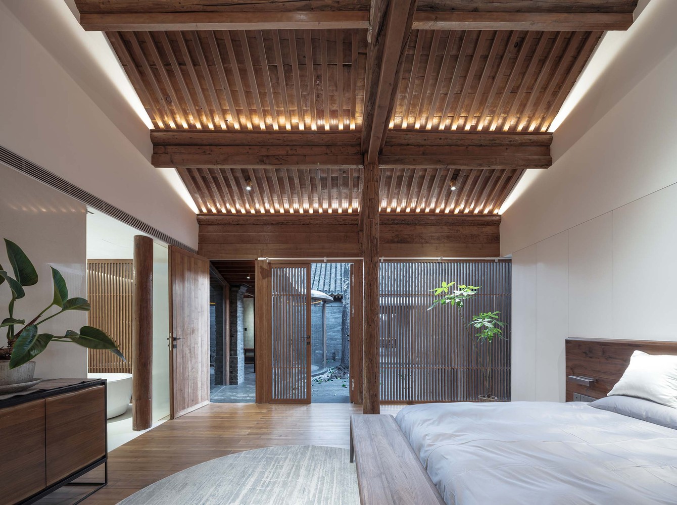 後院是個住宅空間,主要包含兩間臥室、茶水間以及書房。該原始的空間佈局與中間庭院相同,該區域的曲線遊廊一方面與院子中的三棵老樹產生互動,另一方面營造出許多小弧形的休閒空間。臥室的位置是設定在房屋的最後方,根據屋脊呈現對稱的佈局。每間臥室內的浴室都與小院子相比鄰,這樣才能確保有良好的採光與通風效果。