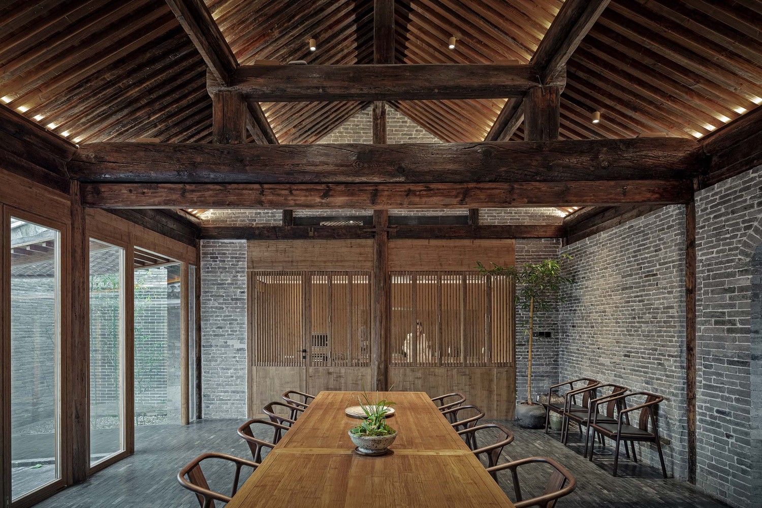在庭院的中間是公共活動空間,原先這個空間有三個房間,一個在北邊,兩個在兩側,根據原本的設計,設計公司在這個區域設計了客廳、茶水間、飯廳以及廚房等。設計師採用對稱式佈局,繼承了傳統庭院建築的形式感。此外,它們可以取代了先前的樓梯,讓房間的樓梯平緩傾斜。斜坡和透明遊廊共同增加了室內空間與開放式庭院之間的連通性。飯廳有一扇折疊門,此們可以將內部空間與戶外空間結合,也可以將室內活動擴展到庭院。在飯廳的後牆中間有一扇拱門,經過修復後成為後院的入口。