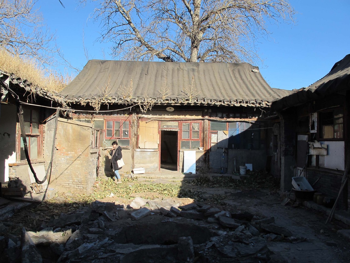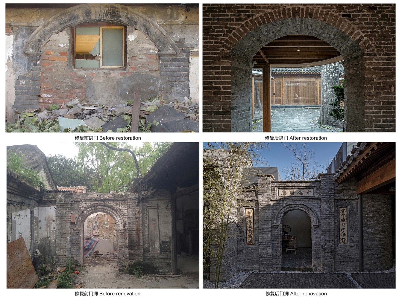 本文由設計工作室所提供。這個舊屋翻新專案位於北京舊城核心區內,七舍合院一個小型的四合院(一種傳統中式住宅,有三個庭院,總長和寬分別為1542公尺。由於七舍四合院共包含七間斜屋頂房屋,加上正好是該胡同的七號,因而得名為「七舍」(「七」和「舍」分別代表中文的「七」以及「房子」)。在翻新前,四合院非常破舊殘破不堪,除了最基本的木結構樑柱和局部有民國時期特色的拱形門保存得相當完好之外,其他大部分的屋頂、牆面、門窗則是嚴重破損或消失。在三個庭院內,有許多幾年前的臨時建築,同時也可以看到屋內遍佈拆除之後的建築廢料,雜草叢生,一片凋零。