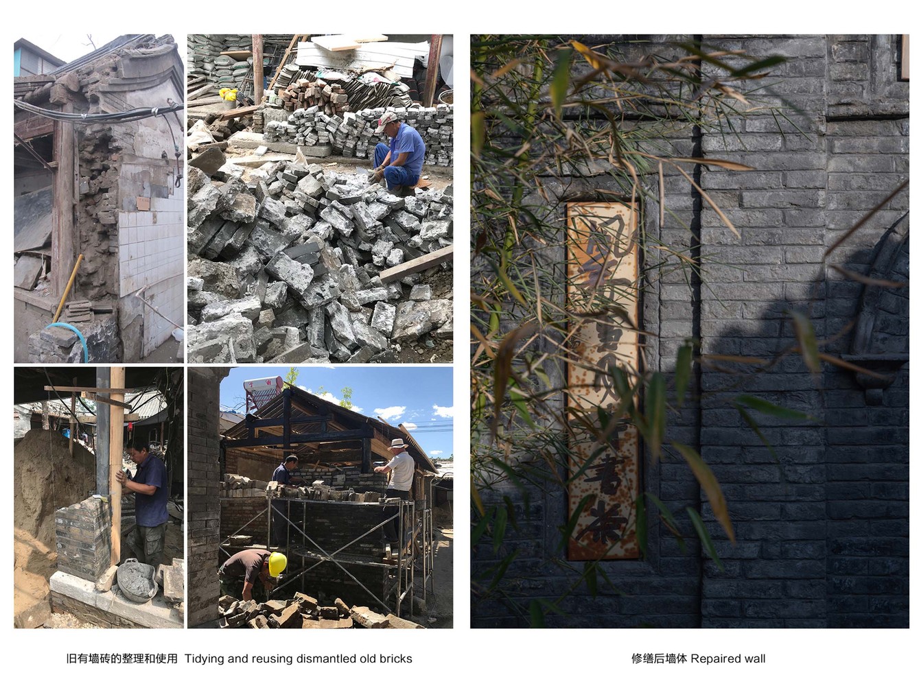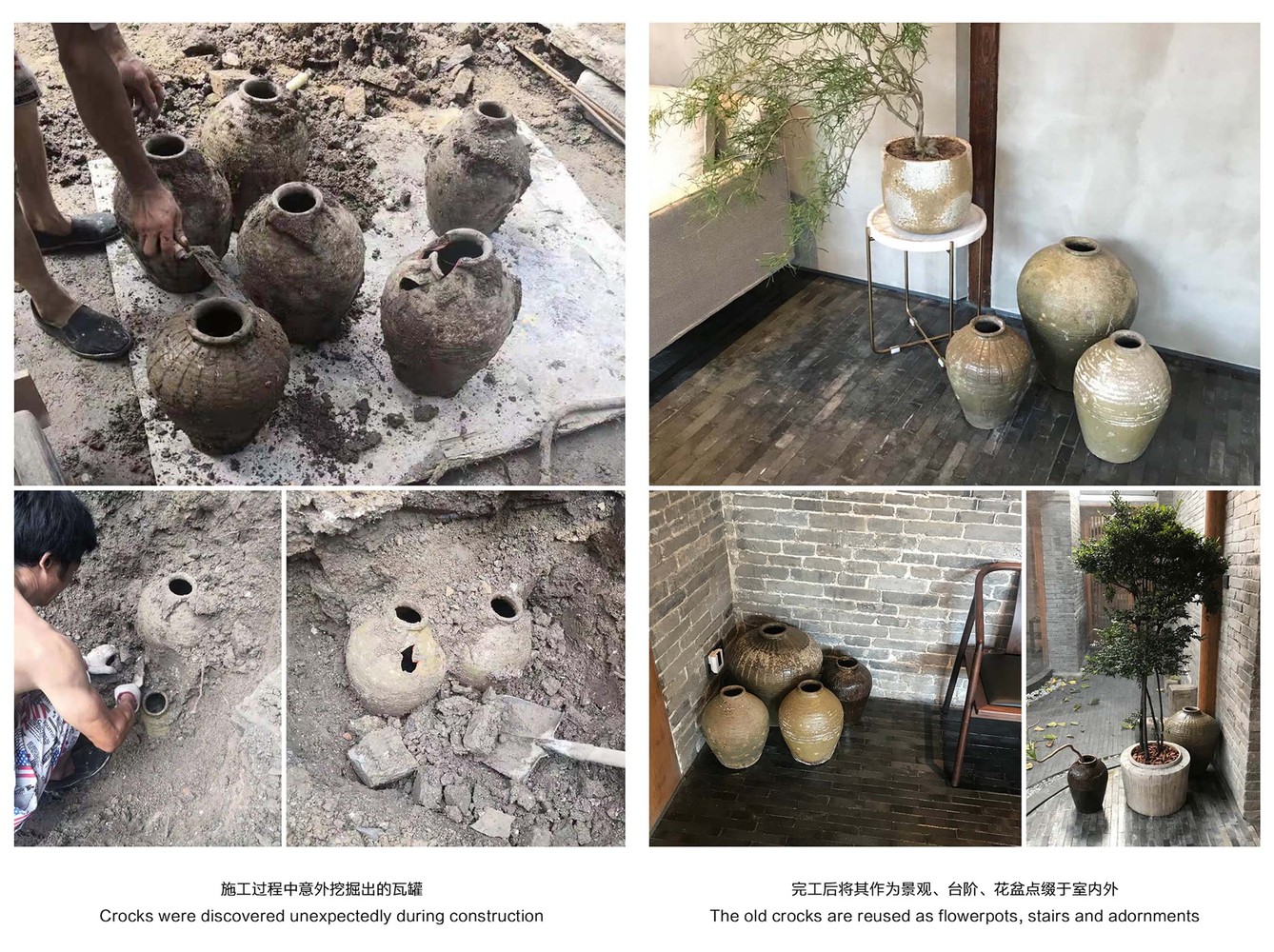 傳統屋頂缺少了現代防水材料,隔熱性能也比較差,因此設計團隊在改造時,保留原本的灰瓦屋頂,優化屋頂系統與性能。而新建遊廊的弧形屋頂,設計師使用聚合物灰漿來拋光,此材料平滑且正好與相鄰的屋瓦紋理相呼應。設計團隊透過再利用的方式,將庭院中臨時拆除的灰色磚塊用來修復舊建物的牆面。而戶外空間的地板也沿用了相同類型的地磚,以確保視覺的一致性。部分新牆面採用了透光的玻璃磚,但尺寸仍與舊建築的灰磚一致。在施工的過程中,意外發現的石片瓦罐以及磨盤等,也在完工後,將其作為台階、花盆以及裝飾品修復過程中的廢棄木樑,則被改造為椅子,賦予這些舊材料有新的生命。