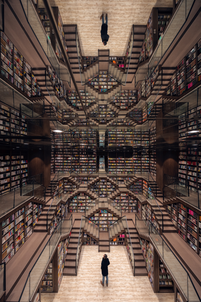 穿過走廊及兒童閱讀室,往前走是主閱讀廳-「梯廳」,階梯被當作書架,讓書架及鏡面天花板看起來更為驚人。訪客能在書架的樓梯上稍作休息,讓自己沈浸在書海和思考中。