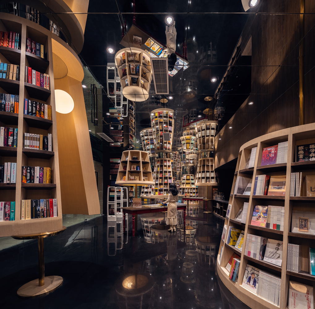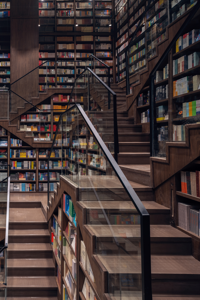 燈罩大廳的一端,是個安靜的閱讀走廊,書櫃沿著走廊往下延伸,書架反射在地面上。有如隧道般的走廊,吸引訪客走進書店更內部的空間,追尋更多的知識。大廳的另一端是兒童閱讀室,而內部的書架充滿繽紛的顏色,並將重慶的景觀、建築及交通融入其中,讓孩童在閱讀中也能沈浸在迷人的重慶之中。