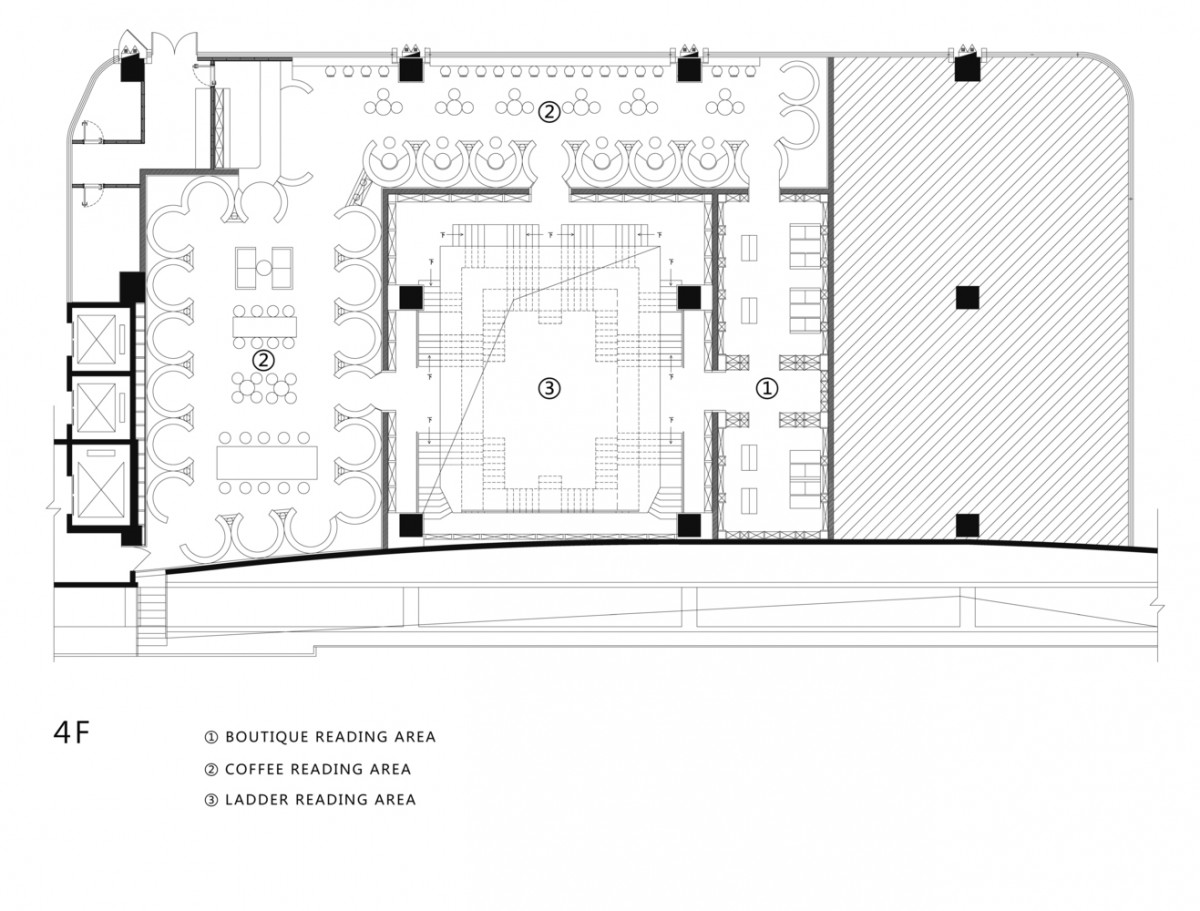 從梯廳走到四樓就是休閒區,訪客可以在這裡享受咖啡的香氣或一杯好茶,並透過不同的書籍,將自己沈浸在寧靜的世界。咖啡廳四周利用「燈罩書架」打造成一個個的隔間,人們可以在此與朋友相聚,一起閱讀或享受他們的休閒時光。與休閒空間連結的是寬敞的閱覽室,閱讀室內陳列許多很棒的作品,人們可以在這邊拓展視野並豐富心靈世界。
