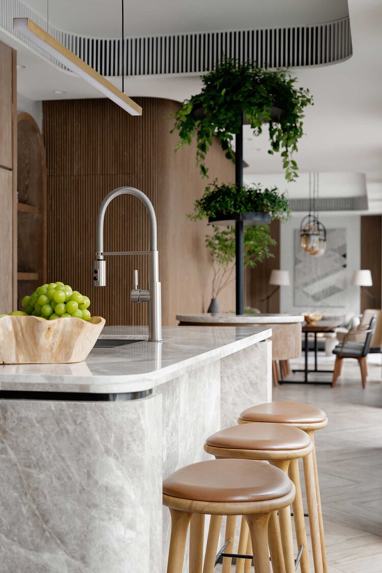在我們第一次實地考察中,我看到那邊種植了椰子樹,帶給人熱帶的感覺,我立刻將這邊想像成位在城市中的住宅度假村。這家店有個開放的廚房,可以用來準備餐點,有個可以當作品酒區的沙龍區,以及一個用於放鬆和社交的戶外區域。考慮到空間的狹小比例,設計中最大的挑戰就在創造出獨特的氛圍,並且與那種只展示並銷售健康產品的商店做區別。我們的目標在於創造一個讓客人有種待在自己客廳的舒適空間,讓客人可以在這裡和朋友一起放鬆身心,享受店內所提供的優質葡萄酒。橡木牆的拱門上擺放各種的保健品,讓客人可以在店內悠閒的瀏覽逛逛。