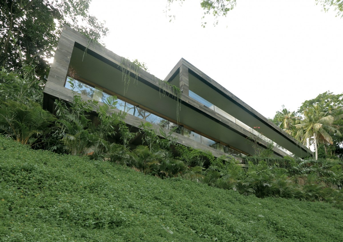 此建物位于巴里島西南沿海地區內那叢林茂密的諫義里村莊,其建蓋在一英畝大小的土地上,觀望著繁茂森林與下方的河流。坐落於陡峭高處的這個建物與接待區和那往西邊流向的溪水之間約有11公尺寬的距離。此雄偉景象給設計師的挑戰即是如何將建物與基地環境連結。
