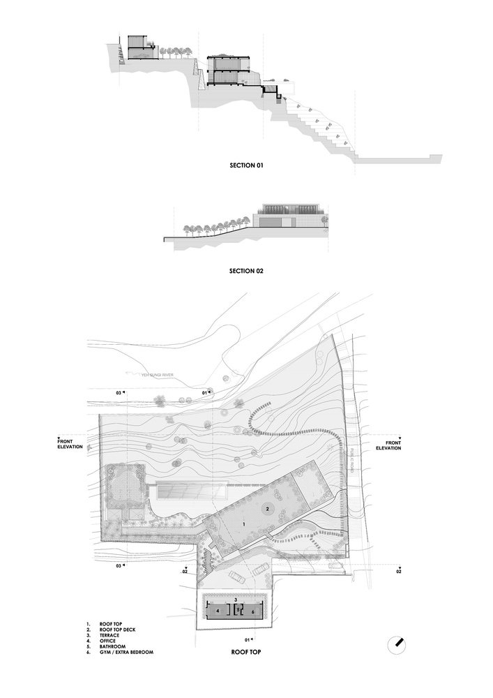 建物蓋在不同土地高度上,其沿著高處輪廓的好位置建蓋便取得往下方河流與森林俯瞰的空間。因應這些標準,土地上輪動的形體也形成了室內與花園之間的空間,不然通常在這養陡峭地形建蓋其實相當困難。