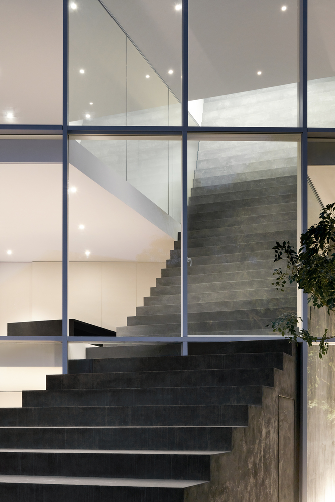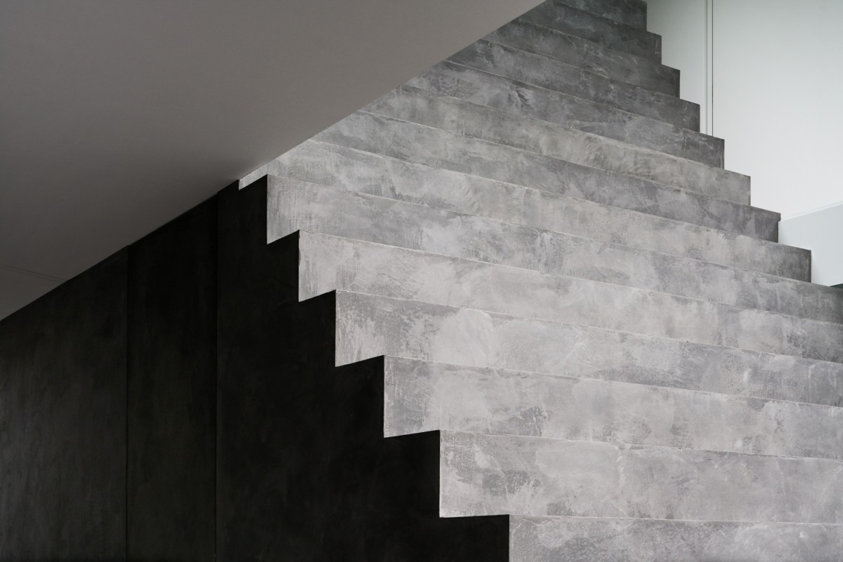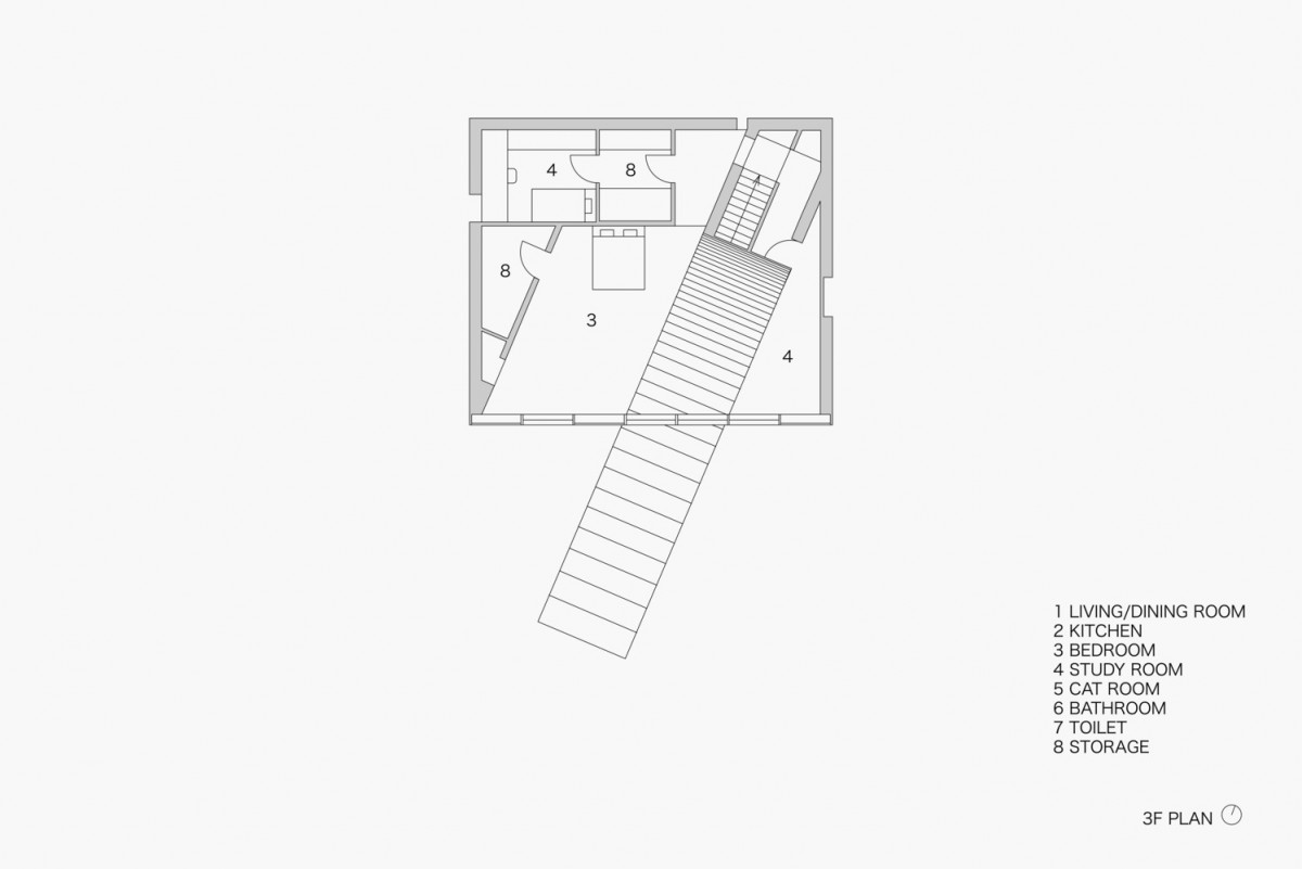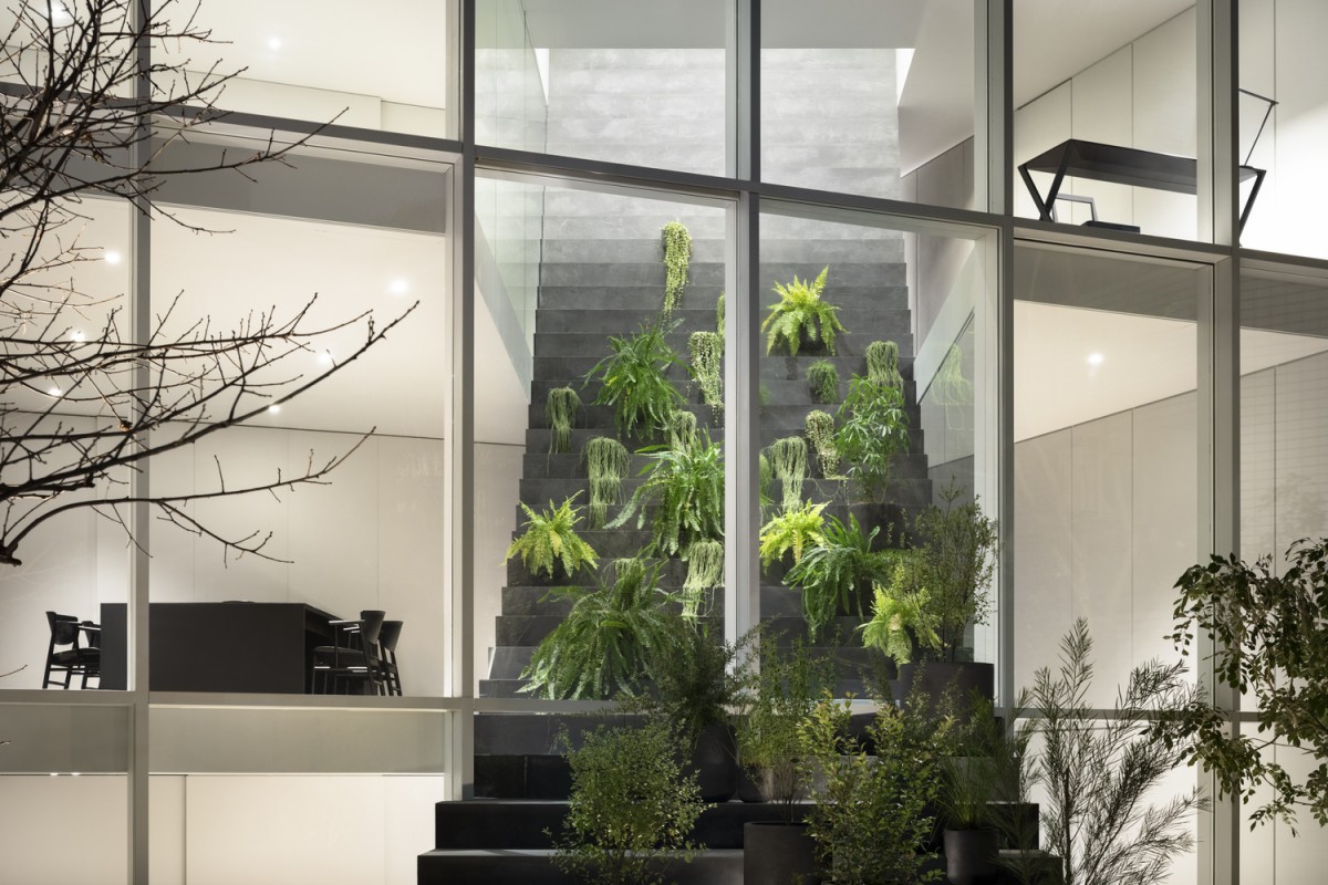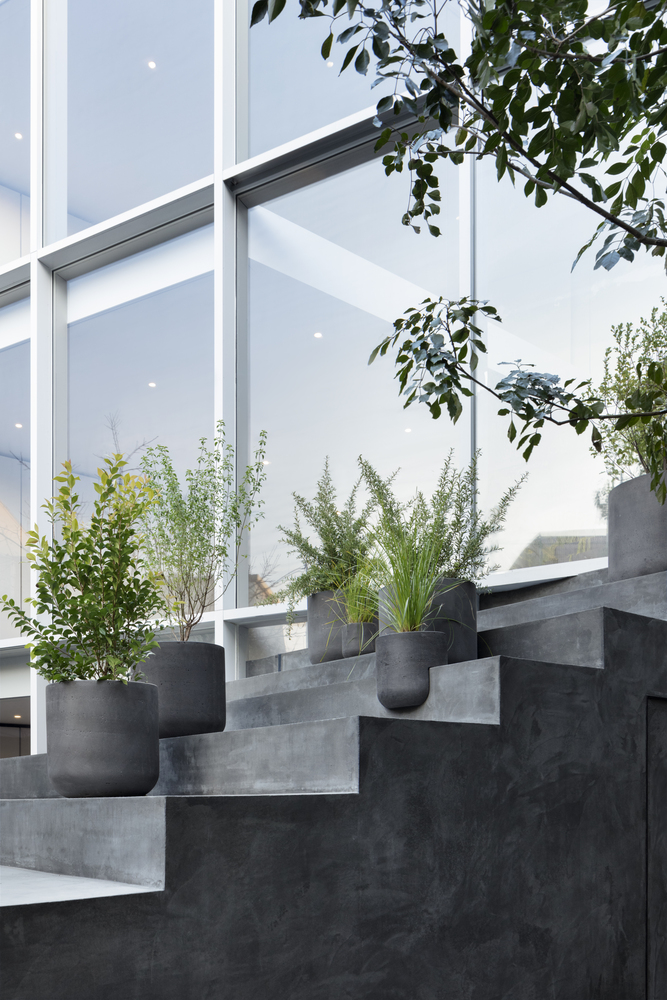 這道大型階梯還具備功能性質,其中段還設置了洗手間。偏往上方的階梯有個半戶外溫室與綠色盆栽,另還提供喜愛日光浴的貓咪一個攀爬走動的空間。這道大型長梯形成對角線,這微妙的設計讓三代同堂有著更舒適的互動。
