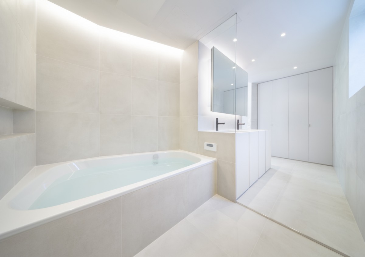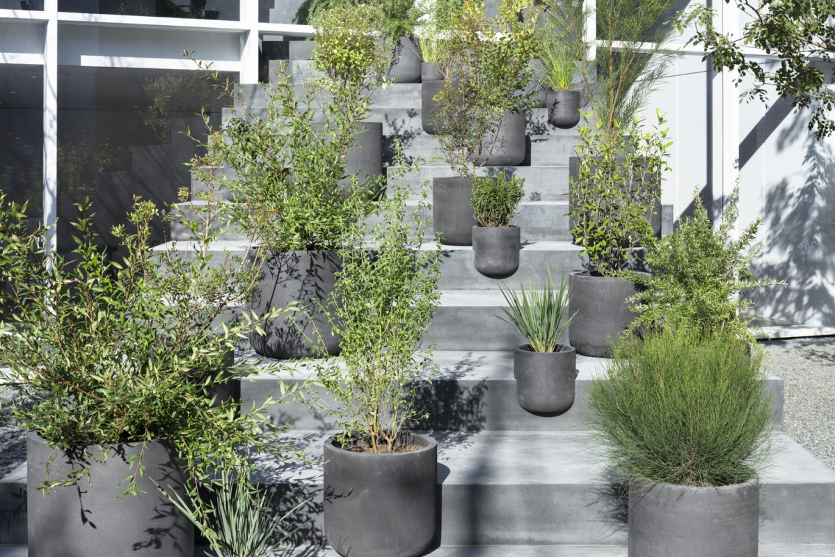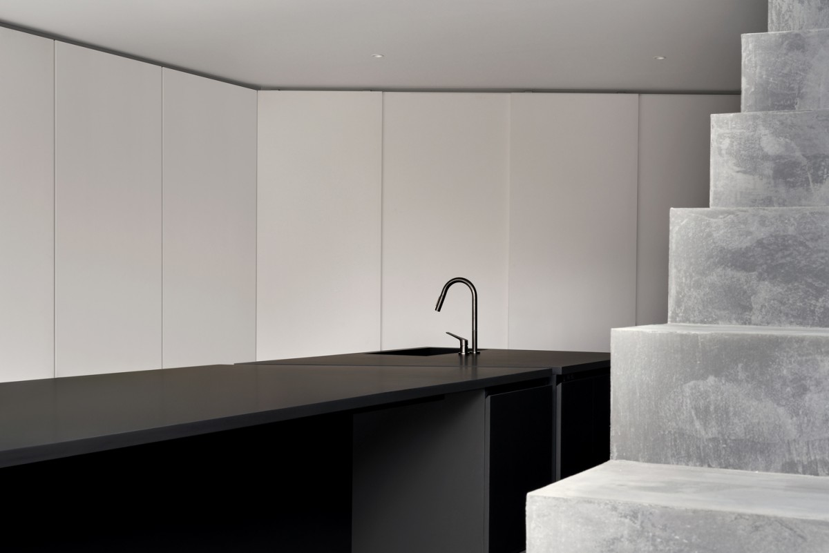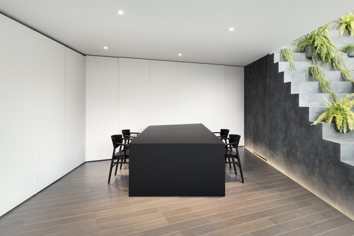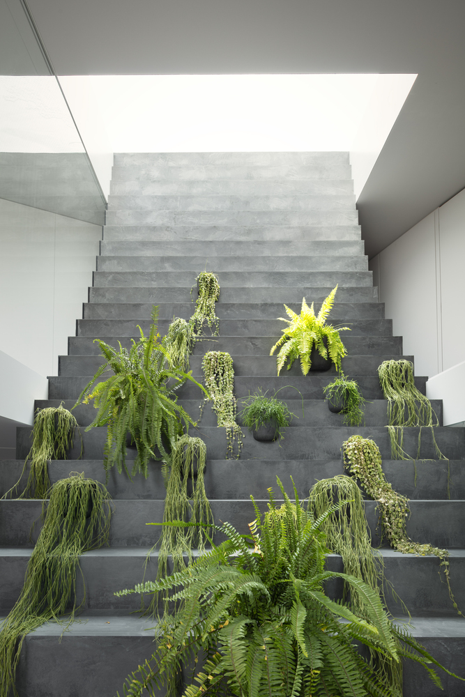 這道大型階梯還具備功能性質,其中段還設置了洗手間。偏往上方的階梯有個半戶外溫室與綠色盆栽,另還提供喜愛日光浴的貓咪一個攀爬走動的空間。這道大型長梯形成對角線,這微妙的設計讓三代同堂有著更舒適的互動。