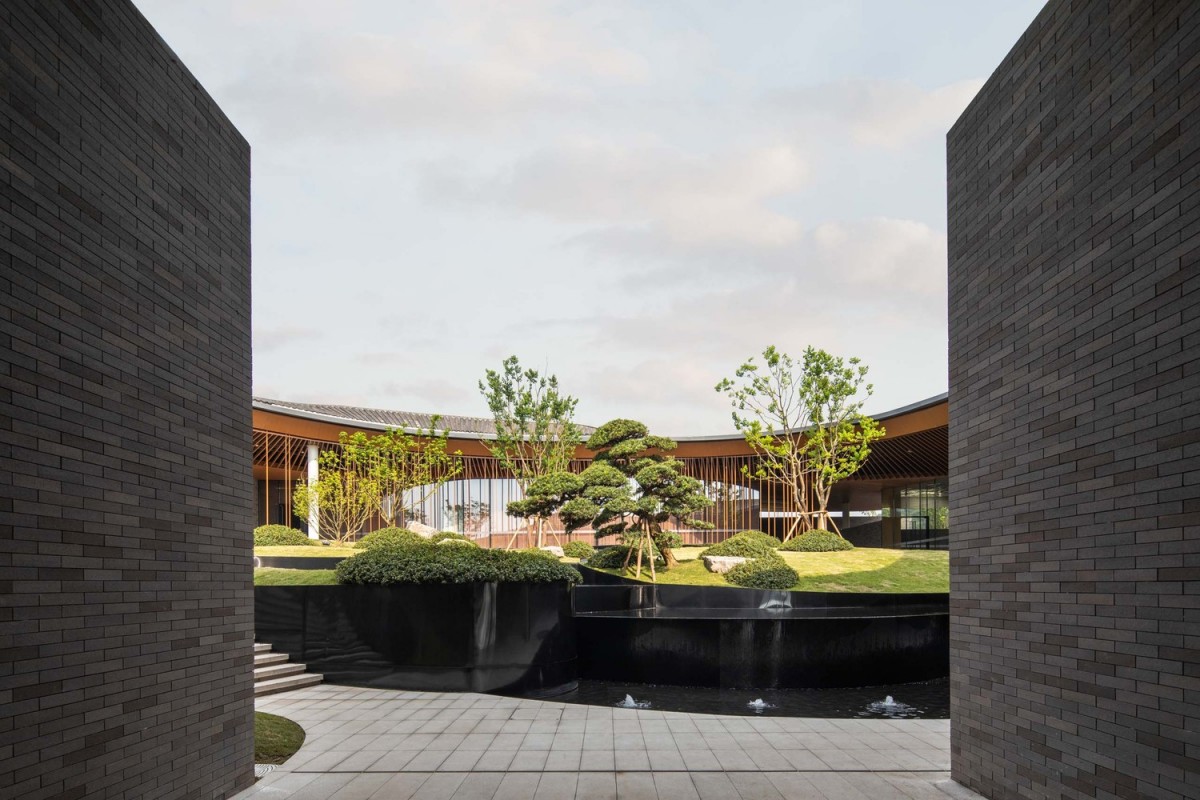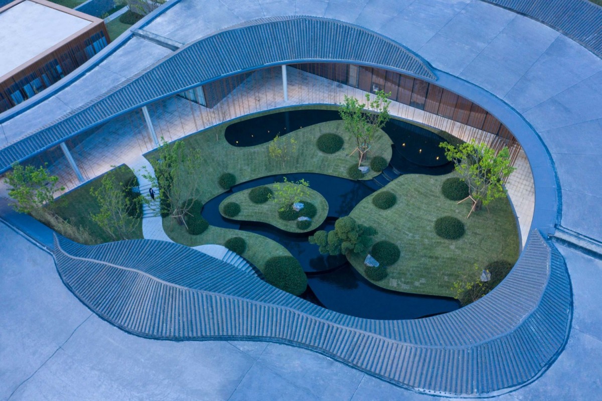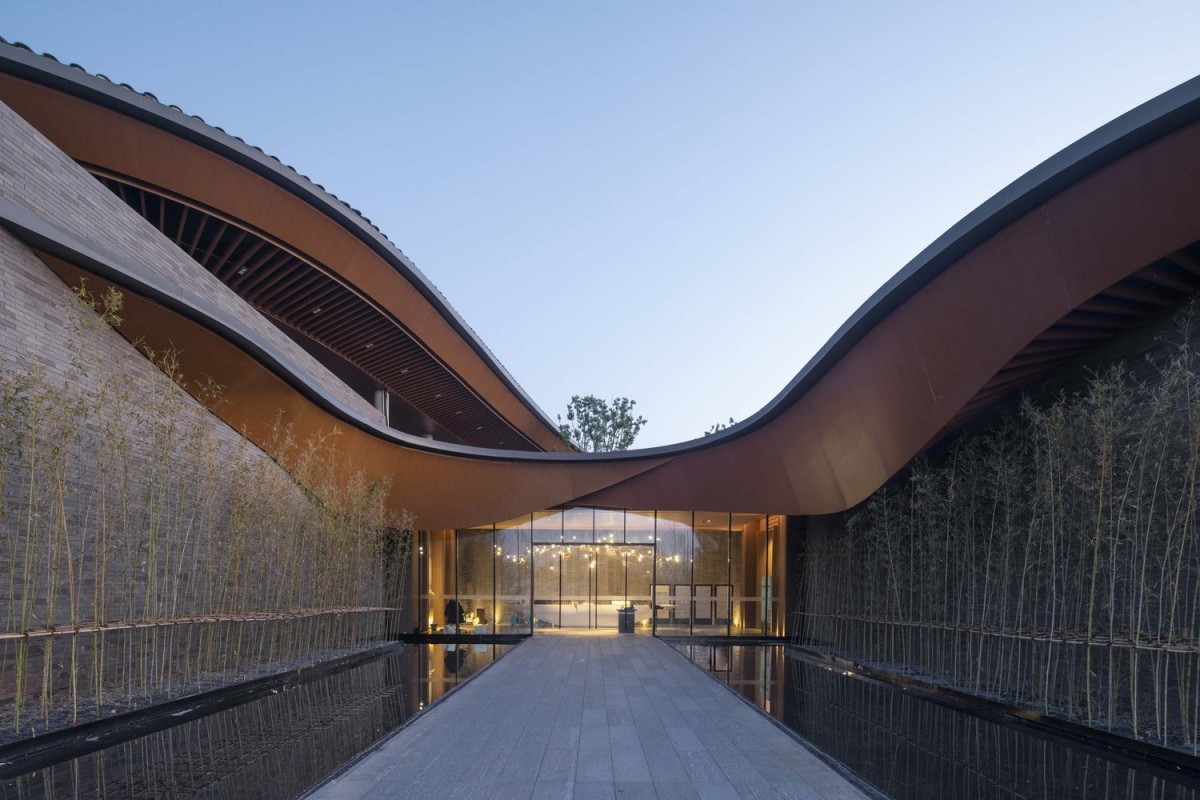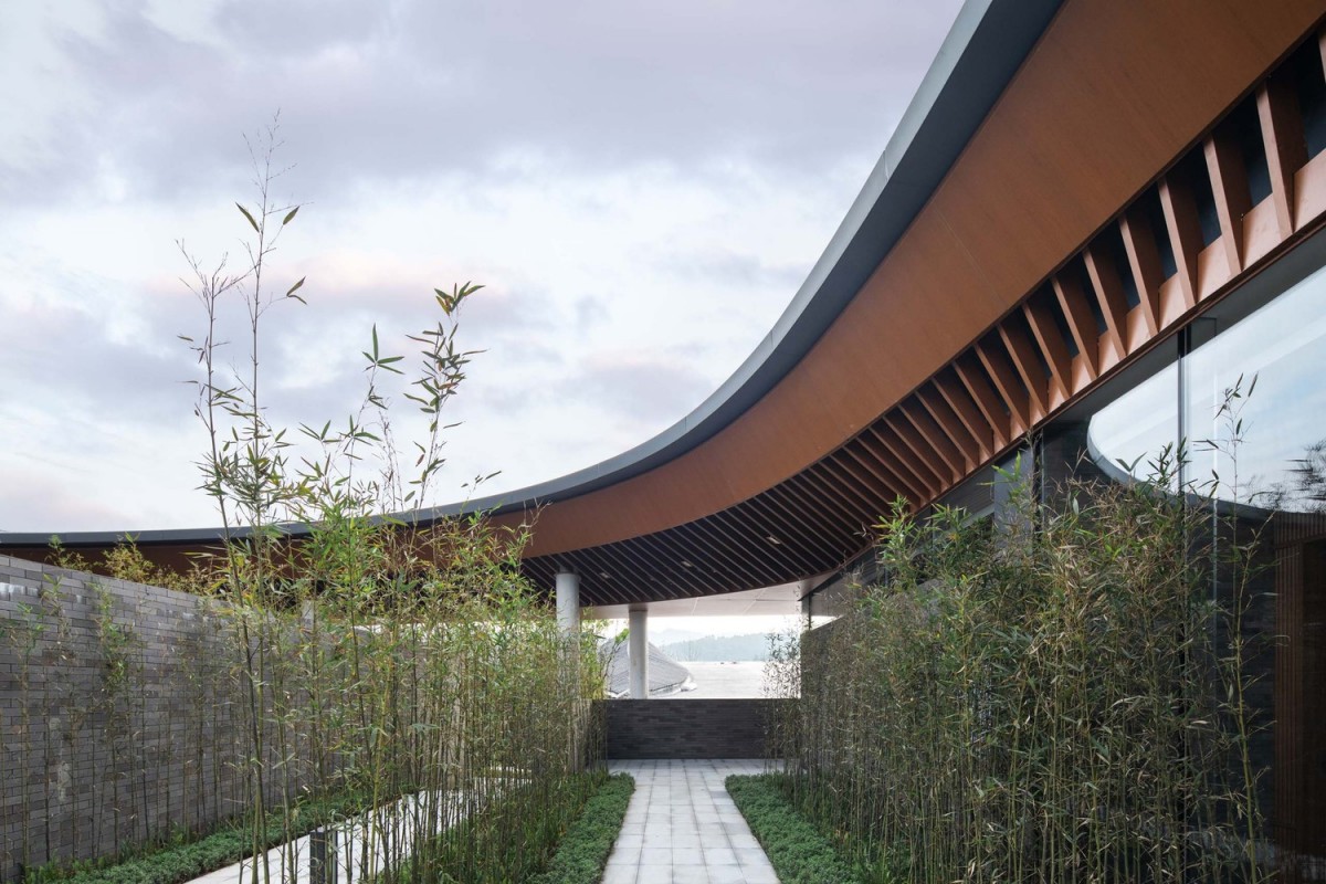 基於這樣的圖底,飯店的空間排列是沿著東西向軸線,形成一系列不同的院子。酒店的牆壁畫出走道的輪廓,沿著牆壁可以看到不同的景觀,也將四周景物融入酒店之中。進入酒店,穿過酒店前的竹林,會經過沿湖景牆,而不斷變化的屋簷將牆壁及建築與景觀和天際連結在一起。走進入酒店的大廳,不同高度的屋簷在此交會。
