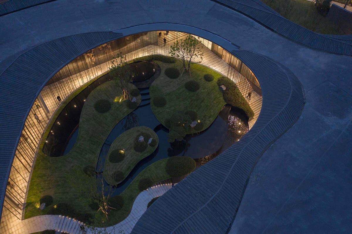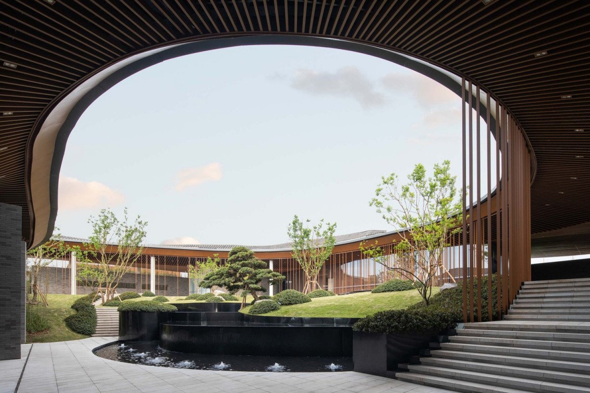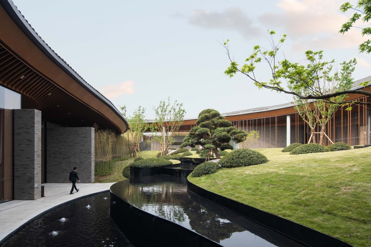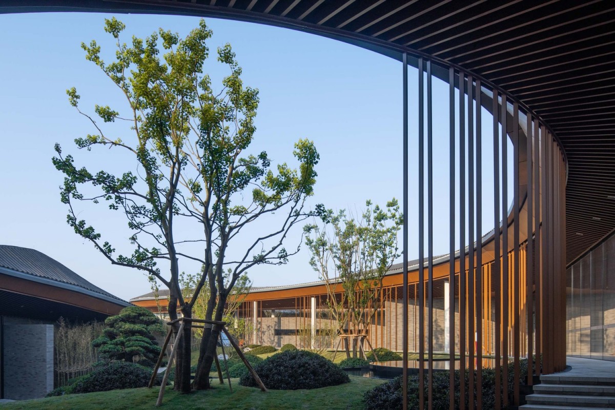 基於這樣的圖底,飯店的空間排列是沿著東西向軸線,形成一系列不同的院子。酒店的牆壁畫出走道的輪廓,沿著牆壁可以看到不同的景觀,也將四周景物融入酒店之中。進入酒店,穿過酒店前的竹林,會經過沿湖景牆,而不斷變化的屋簷將牆壁及建築與景觀和天際連結在一起。走進入酒店的大廳,不同高度的屋簷在此交會。