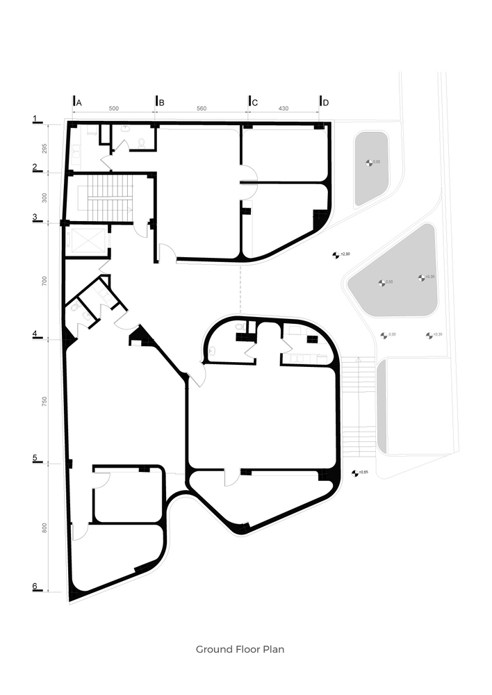 正負空間的的相互作用強化了地方營造及空間品質;因此,光線和視線連結是突出的特徵,而形式與空間則相互補充。曲線型的外牆隨著凹凸運動,在各樓層之間形成露台以及會議場所,並打造一樓為宜人的城市通道。
