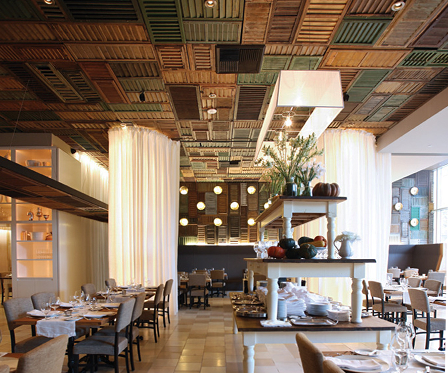 秉持著『質樸奢華』的原則,UXUS打造了一個用餐空間,用簡單的物品來營造最基本的美感和高尚⋯⋯500個殘舊的匈牙利百葉窗排列在牆壁和天花板上,將饕客們包圍在質樸的質感和色彩中,且波浪般的白色窗簾讓整個空間變得更柔和。