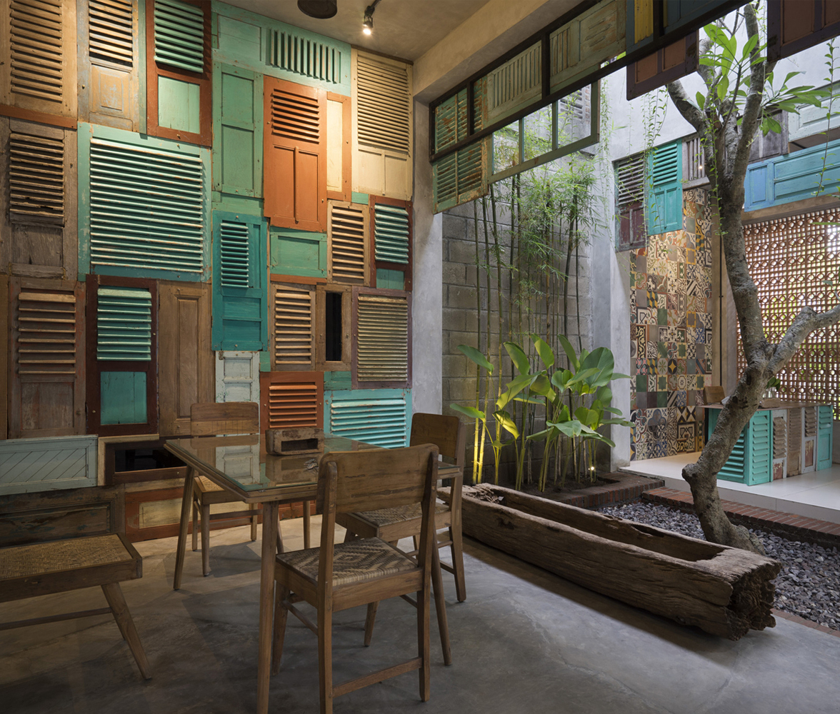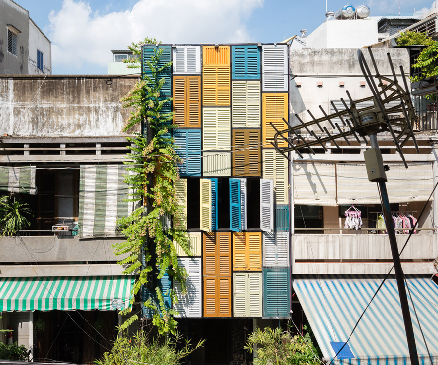 「老舊的百葉窗賦予了房屋外牆有著獨特的外觀。數十年來,這些窗戶已經在越南使用數十年了,當時這些百葉窗能讓屋內保持通風。現在這些百葉窗重新佈置成新建築外牆,透過流行的色彩,與周遭地區的古老元素融為一體⋯⋯。