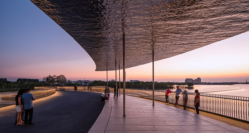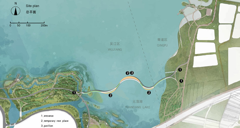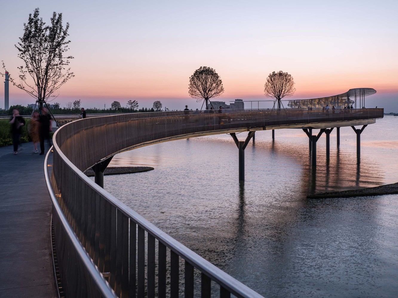 由BAU建築與城市設計事務所(更多資訊請點擊這裡)所設計的元蕩橋,從元蕩湖的東到西橫跨湖的南邊兩岸。6米寬的露天平台被劃分為三個界線分明的帶狀結構–一條自行車道、一條步道以及一條植被帶。橋上有三個景觀平讓人們可在此休憩,並在此欣賞湖泊以及城市的美景。
