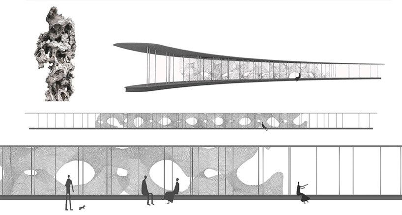 建築與城市設計事務所(BAU)將這個元蕩行人天橋設計成連接江蘇省以及上海之間的橋樑。該團隊形容這項工程是「混合結構」,因為它集景觀設計、基礎設施和建築於一體,整座橋全長586公尺(1,920英尺),橫跨整個元蕩湖,並且由y型鋼柱支撐。景觀行人橋上種植了樹木以及灌木,且橋身如同一條緞帶,蜿蜒穿過湖面的漂浮花園,與元蕩湖上的水波相呼應。